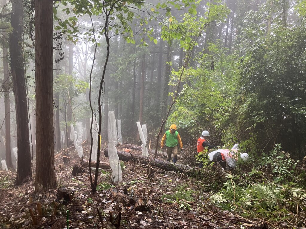 植樹体験では鍬を入れる場所すべてに木の根が張り巡らされており、穴を掘る作業が想像以上に大変でした。と同時に、山全体がこうして無数の根によって支えられているのだということを、身をもって実感することができました。また、作業の合間に伺った「木は成長過程でCO2を吸収すること」や「花粉症の人でも直接花粉を浴びる分には平気な場合が多い」といった話も興味深かったです。天候には恵まれなかったものの、学びの多い充実した一日となりました。(情報システム部・男性)