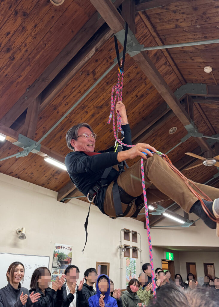 ▲植樹後に、林業のロープワークも体験。小屋の梁に渡したロープで、3メートルの高さを昇り降りしました。