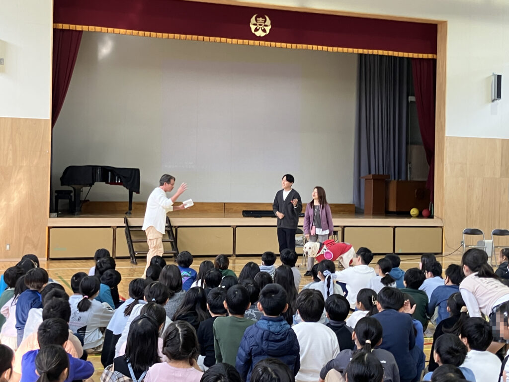 盲導犬ユーザーである当社社員が、お話や寸劇、盲導犬のガイド実演などを織り交ぜて、視覚障がいや盲導犬について知っていただく場を提供しています。同時に、相手の立場になって考えること、困っている人の助けになるにはどうしたらいいか…などを考える場としました。