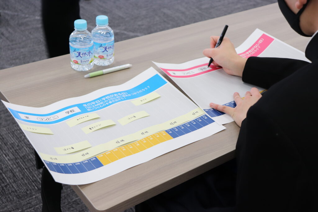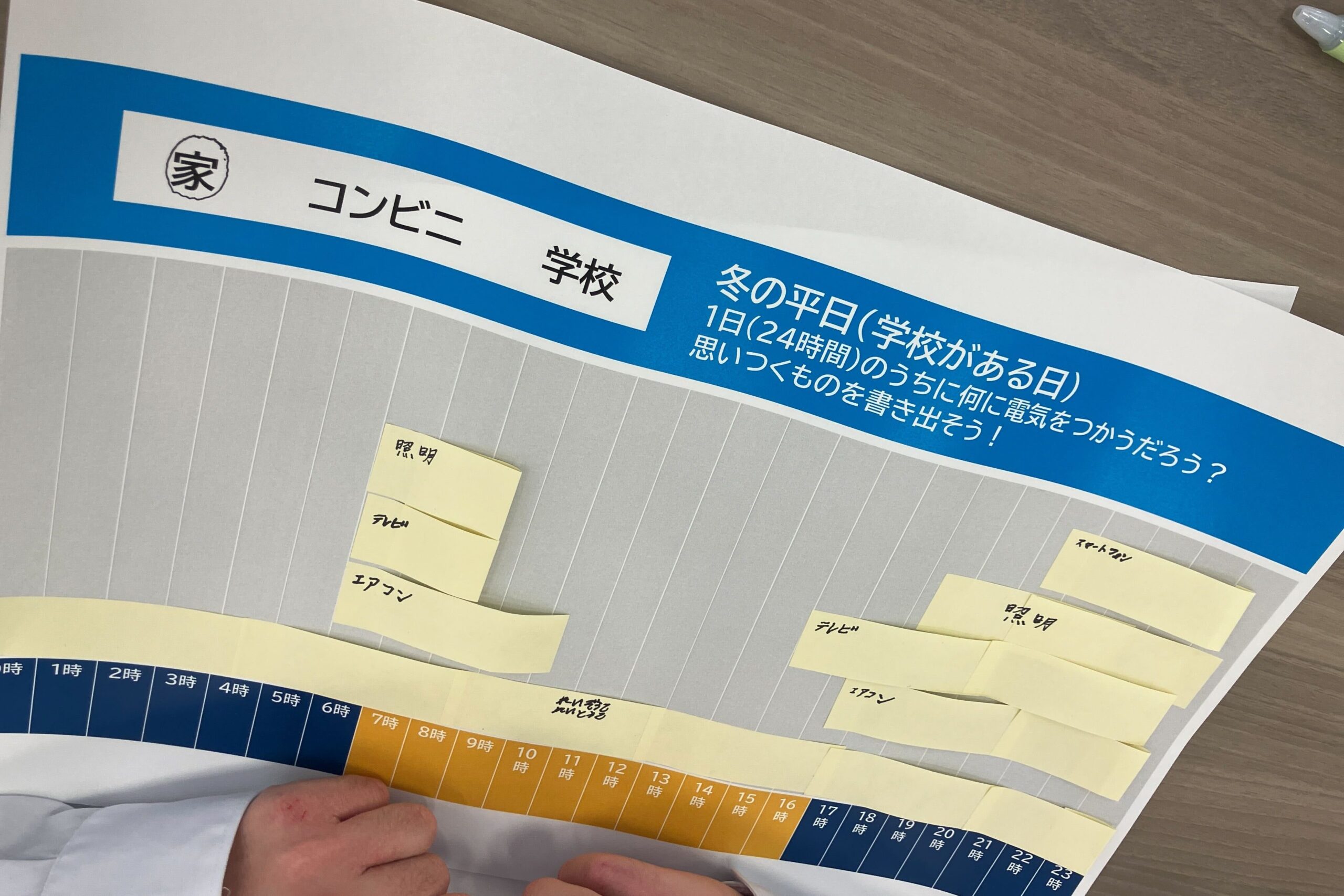ワークでは、街のどんな場所で、いつ、何に電気が使われているかを想像し、24時間の使われ方をグラフにします。みなさんは黙々と手を動かし、日ごろの生活動線を思い出しながら、電気を使っている場面をつぶさに書き出していました。全員、驚くほどリアルで鋭い予測をアウトプットしてくれました。