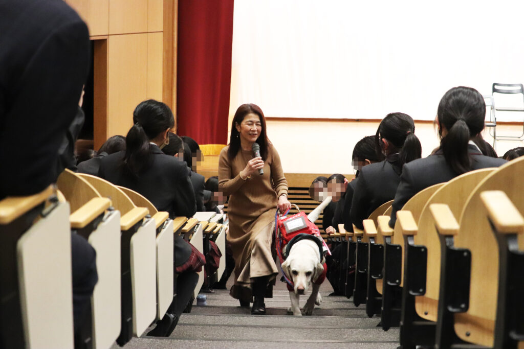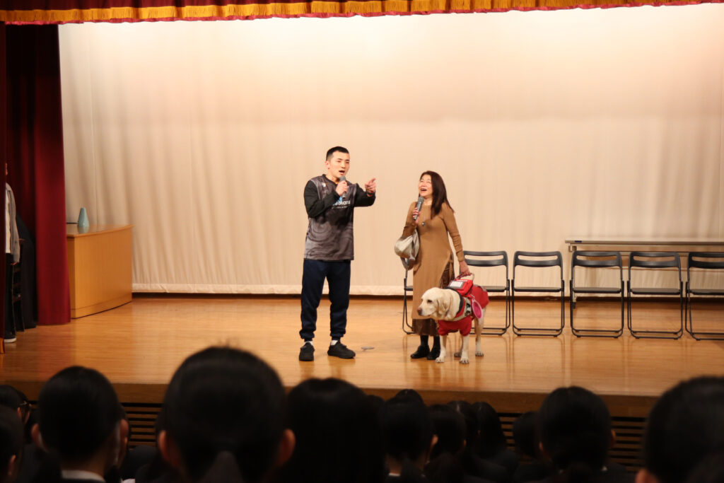 特に盛り上がったのは、中学校の先生方にもご協力いただいた「寸劇」です。日常の困ったシーンを再現するなかで、「どう声をかけたら助けになるのか」を生徒と一緒に考えました。また、盲導犬が指示に従って空席を見つけるデモンストレーションでは、その賢明な姿に拍手と歓声が上がりました。