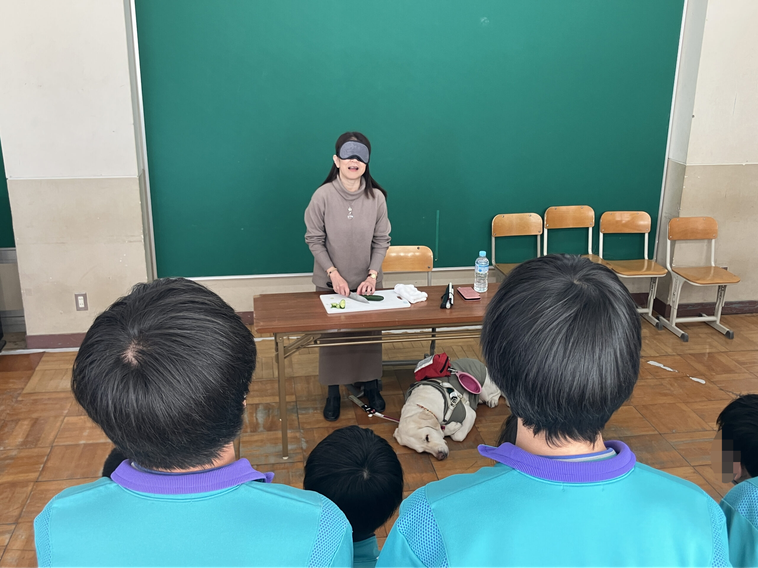 また、盲導犬によるガイドの実演では、生徒の周りをぐるりと回って導いたり、ドアの場所を伝えたり、という盲導犬の働きを実際に見てもらいました。 最後の質問タイムでは、「電車の改札はどうやって入るの?」「お料理はどんなふうに作るの?」といった、生活に密着した率直な疑問が寄せられました。一つ一つの質問に丁寧に答えながら、お互いへの理解を深めました。