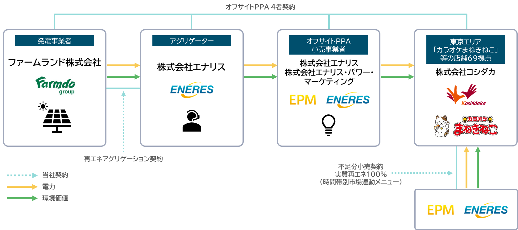 株式会社コシダカ(東京本社:東京都渋谷区、代表取締役社長 腰髙博、以下「コシダカ」)、ファームランド株式会社(群馬県前橋市、代表取締役 岩井雅之、以下「ファームランド」)、株式会社エナリス(東京都千代田区、代表取締役社長 都築実宏、以下「エナリス」)および株式会社エナリス・パワー・マーケティング(東京都千代田区、代表取締役 内田泰裕、以下「EPM」)は、コシダカが展開する「カラオケまねきねこ」等の東京エリア69拠点へ追加性のある再生可能エネルギー(以下、再エネ)を供給するオフサイトPPA 契約を締結しました。2025年10月15日より供給を開始します。