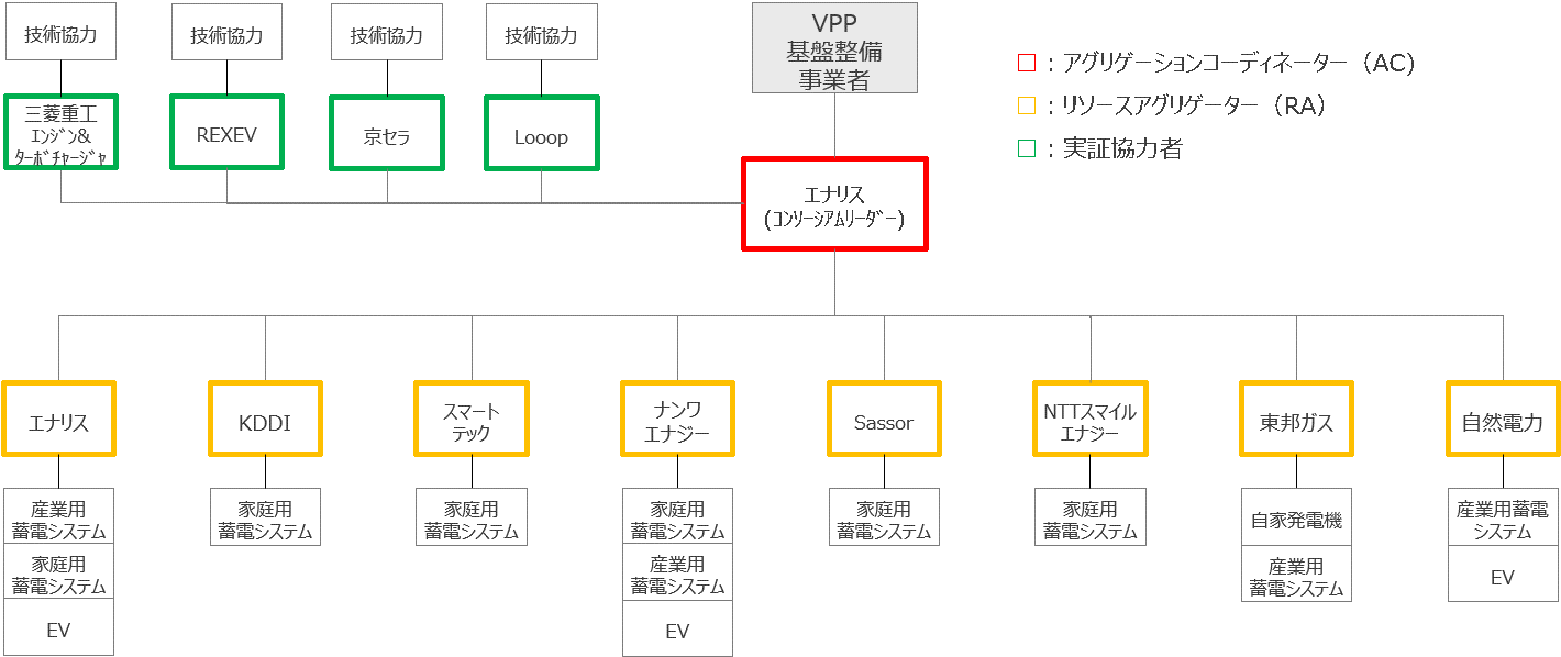 | リソースアグリゲーター | 株式会社エナリス、KDDI株式会社、東邦ガス株式会社、株式会社ナンワエナジー、株式会社スマートテック、 自然電力株式会社、株式会社Sassor、株式会社NTTスマイルエナジー |